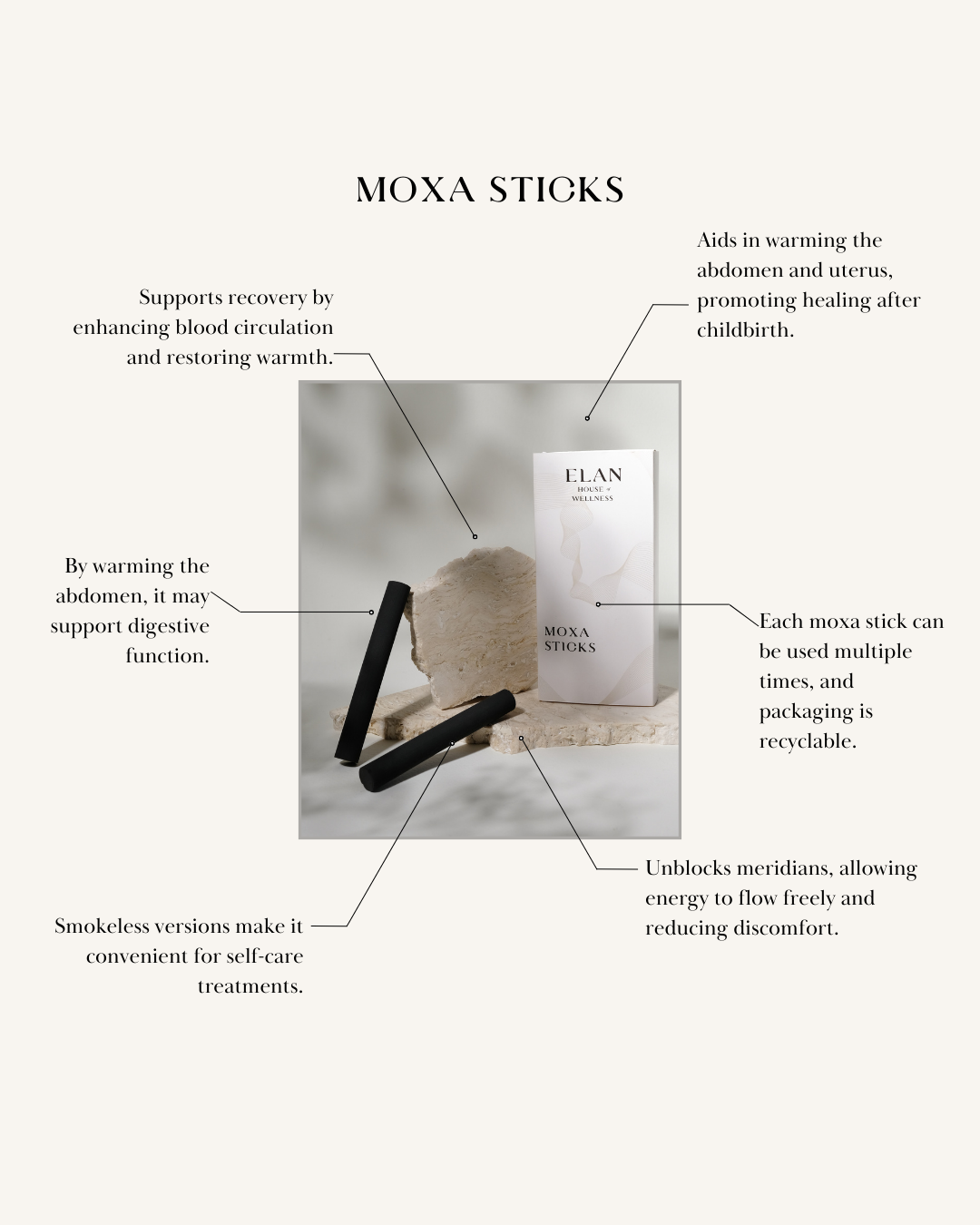 Each box includes 2 smokeless moxa sticks with each stick measuring 1.8cm in diameter x 12cm in length.